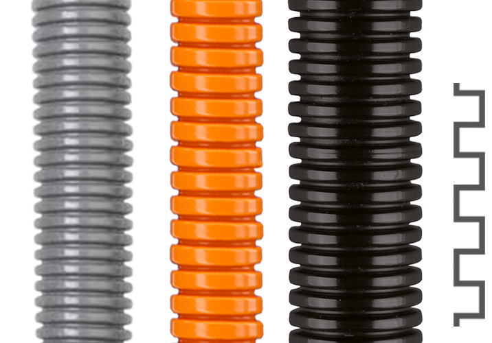 Protective all-plastic tubing from ROHRflex PA 12-S series developed by Flexa. Available in black, gray and orange with fine profile.