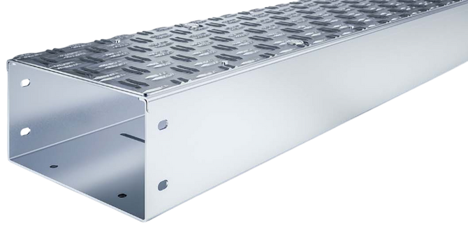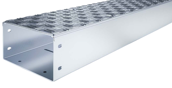 Automobil-Trunking by PFLITSCH is designed for extreme industrial conditions. Made of 2 mm thick galvanised sheet steel, it is exceptionally stable – even with large distances between support points. This applies to both smooth sheet metal and the base of the corrugated sheet metal (aluminium). The design of the trunking allows it to be used safely as a floor element – it can withstand a pressure of up to 1200 N, which means that it is safe to walk on. The Schwerlastdeckel cover made of corrugated sheet metal provides anti-slip properties in accordance with class R10.