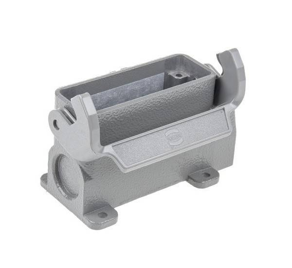 - Harting 09 20 016 0251 to cokołowa obudowa złącza w rozmiarze 16A, z pojedynczą dźwignią i bocznym otworem z gwintem Pg 16. Poziom ochrony IP65. Kolor szary, RAL 7037.