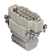 Poliwęglanowy wkład złącza przemysłowego typu męskiego CSSM 10 w rozmiarze 57.27. Produkt z serii CSS. Posiada 10 pól kontaktowych + uziemienie (PE) i montowany jest przy pomocy podwójnych zacisków sprężynowych. Rozmiar AWG 26 -14, przekrój przewodu 0,14 - 2,50 mm². Posrebrzane miedziane kontakty. Produkt może pracować z prądem o natężeniu 16 A i napięciem 500 V, a znamionowe napięcie udarowe wytrzymywane wynosi w przypadku prezentowanego wkładu 6 kV. Zakres temperatury pracy to -40...+125 °C. Wkład wykonany z samogasnącej żywicy termoplastycznej (V-0 wg standardu UL 94). Stopień ochrony IP20 bez obudowy (IP65/IP66/IP68/IP69 z obudową). Kolor RAL 7032.