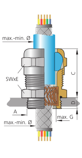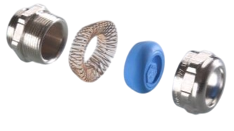 Dławnica EMC z mosiądzu niklowanego z wkładem uszczelniającym z TPE i sprężyną z niemagnetycznego brązu o bardzo szerokim zakresie dławienia. Produkt ten posiada gwint od M12 do M85, zapewnia szczelność IP68 (do 15 bar), IP69.